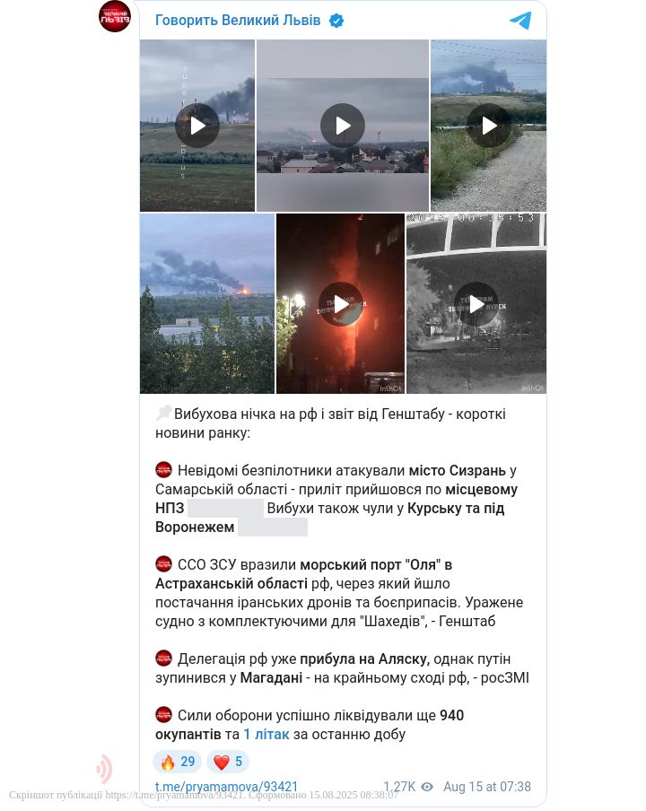 У російському місті Сизрань Самарської області вранці пролунала серія вибухів. Місцеві жителі повідомляють про атаку невідомих безпілотників на нафтопереробний завод.