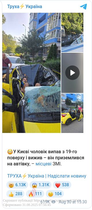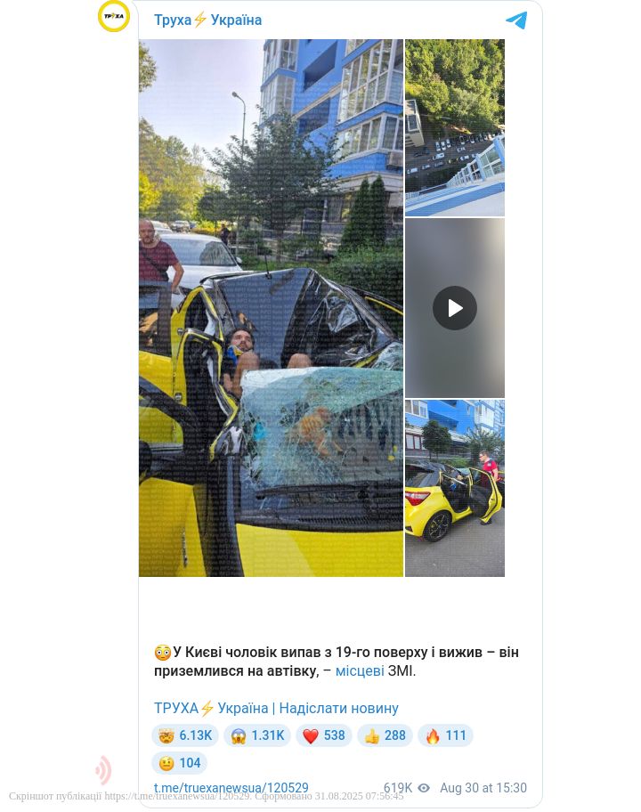 У соцмережах оприлюднили фото і відео з місця подій, де видно, що чоловік впав на чужий автомобіль і пошкодив його, але це врятувало йому життя.