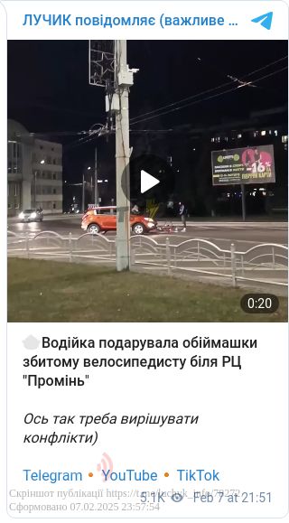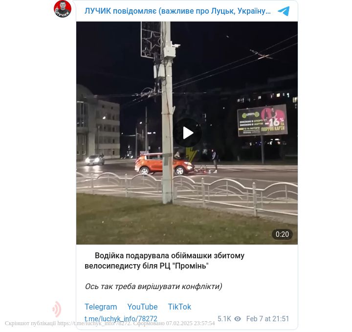 Проте очевидців дуже здивував спосіб вирішення ситуації – водійка, яка збила велосипедиста, почала обійматися з ним.