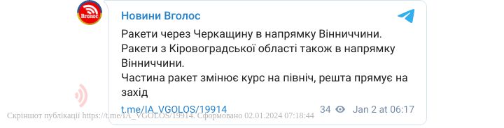 У ніч проти 2 січня 2024 року удруге за ніч в Україні оголошена масштабна повітряна тривога. У Деснянському районі Києва палає уламок зитого російського БпЛА на відкритій місцевості.