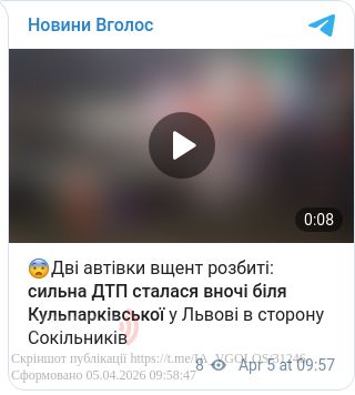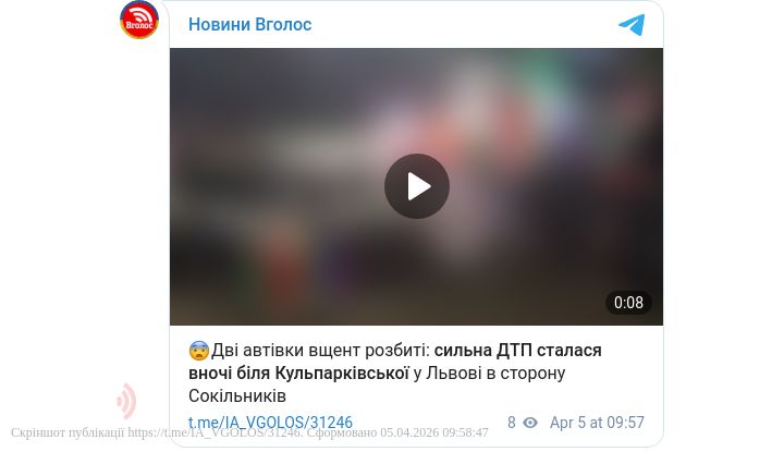 У Львові вночі 5 квітня сталася серйозна дорожньо-транспортна пригода — поблизу вулиці Кульпарківської у напрямку Сокільники зіткнулися два автомобілі.