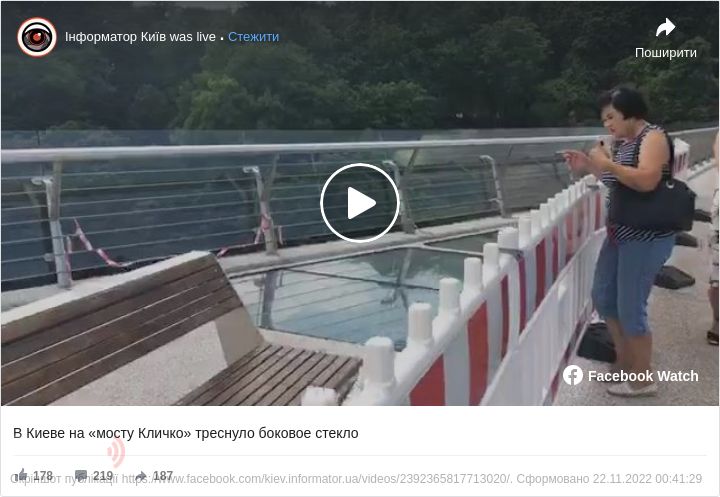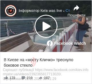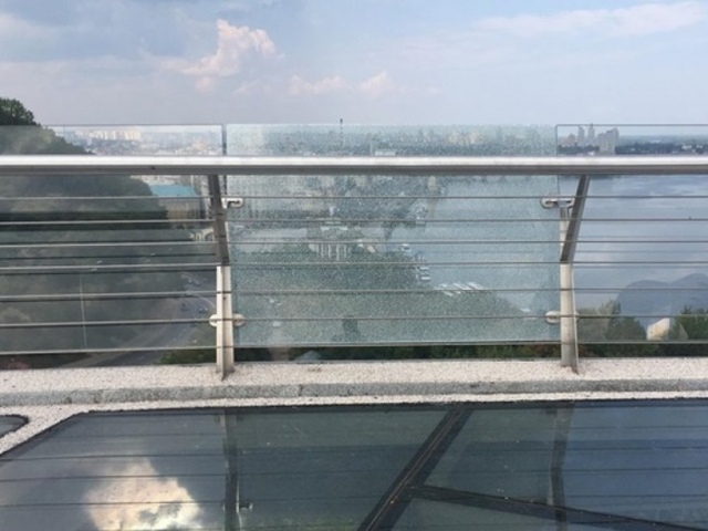 На пішохідно-велосипедному мосту, який з’єднує парки «Володимирська гірка» і «Хрещатий», в народі «міст Кличка» в Києві, тріснуло скло перильних огороджень.