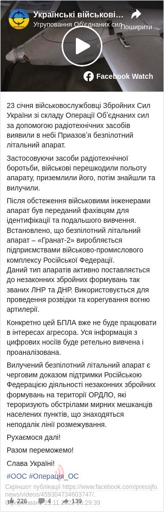 За даними відомства, 23 січня за допомогою засобів радіотехнічної боротьби, військові завадили польоту апарату, приземлили його, а потім знайшли та вилучили. Наразі безпілотник передали фахівцям для ідентифікації та подальшого вивчення.