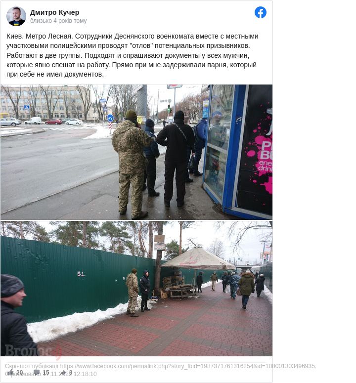Раніше у Facebook журналіст Дмитро Кучер написав, що у Києві біля станцій метро представники військкоматів разом із поліцейськими зупиняють і перевіряють документи у чоловіків призовного віку. Їх відвозять до військкоматів, де з'ясовують, чи мають вони зараз іти в армію.
