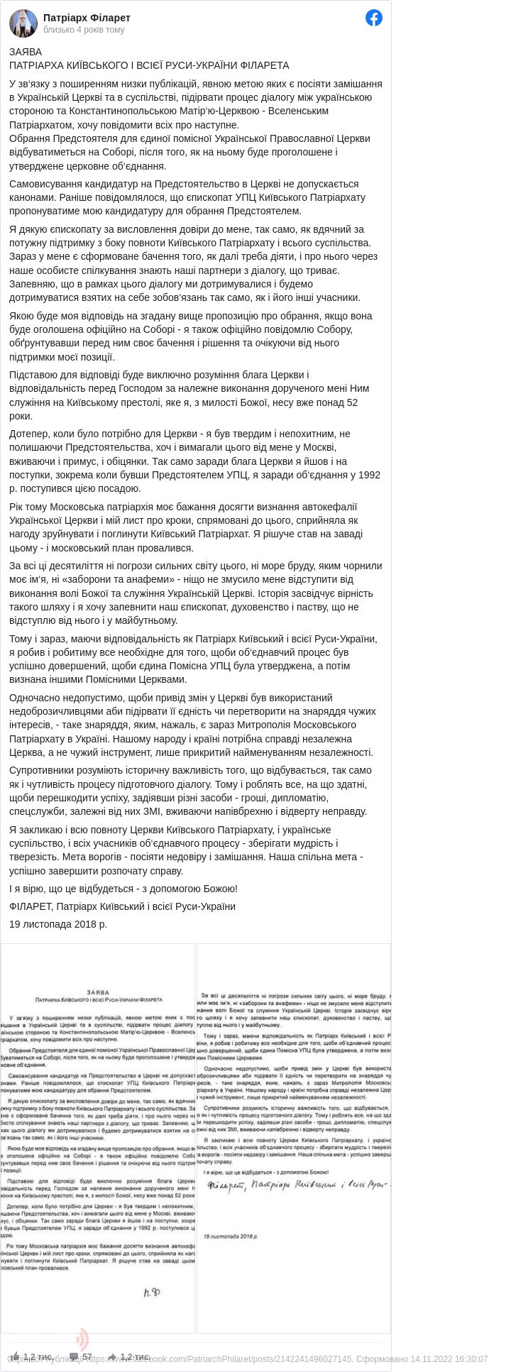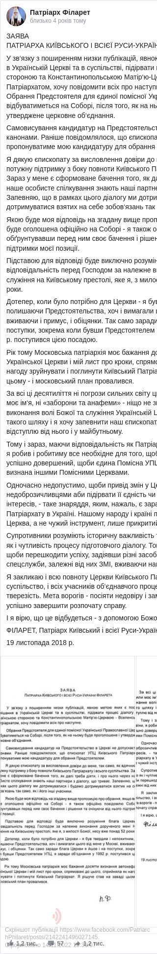 Патріарх УПЦ КП Філарет на офіційній сторінці у Facebook оприлюднив заяву, в якій запевнив, що не висуватиме самостійно свою кандидатуру для обрання предстоятелем єдиної Української церкви.