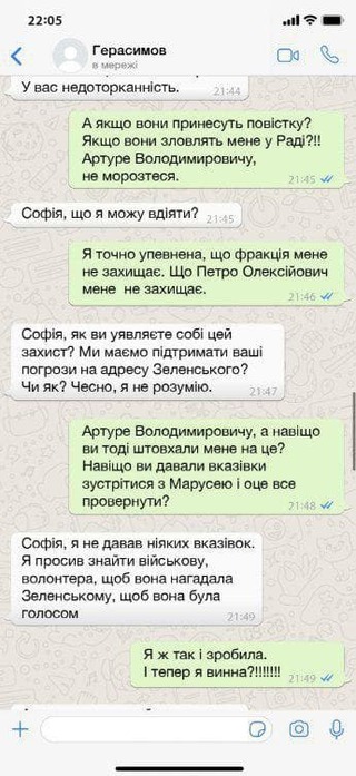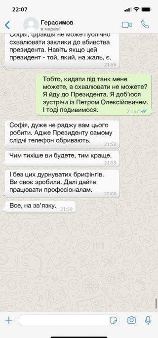 Там нібито Порошенко дає вказівку Герасимову сконтактуватися із депутатами Медведчука, щоб спільно «збити» Богдана Яременка. Ірина Луценко нібито домовляється із депутатом Медведчука про інтерв’ю «з акцентами» на одному із каналів, а Софія Федина нібито жаліється Герасимову, що, мовляв, її підставив партійний бос.