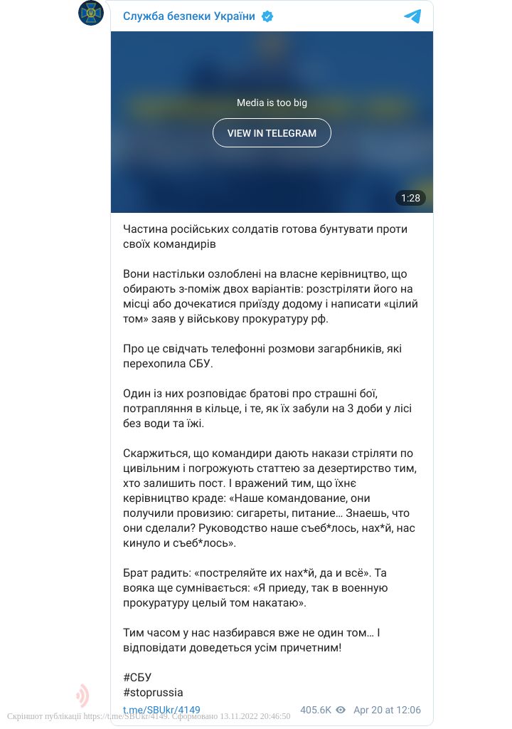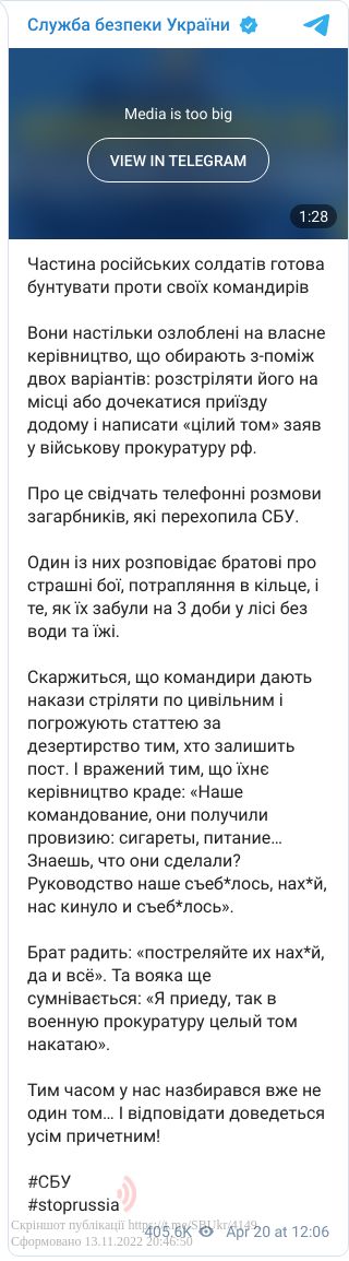 Служба безпеки України перехопила розмову окупантів де вони заявляють що готові бунтували проти своїх командирів.