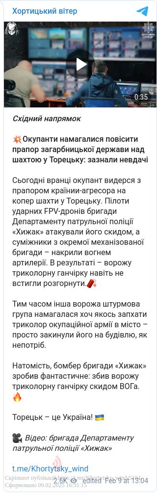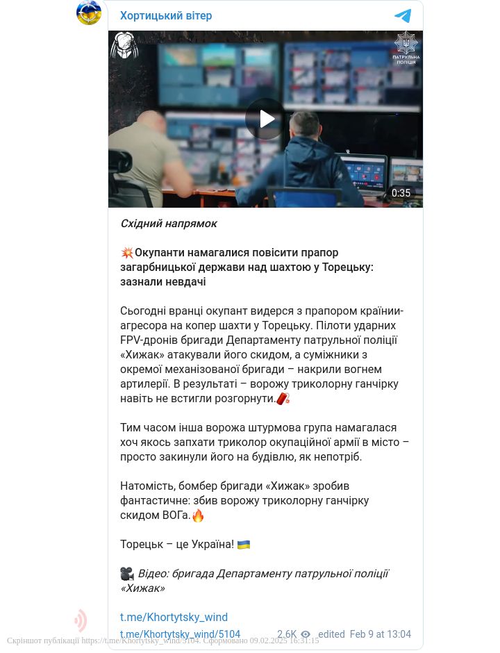 9 лютого російські окупанти намагалися підняти прапор країни-агресора над шахтою в Торецьку, проте українські військові зірвали їхню спробу, відкривши вогонь.