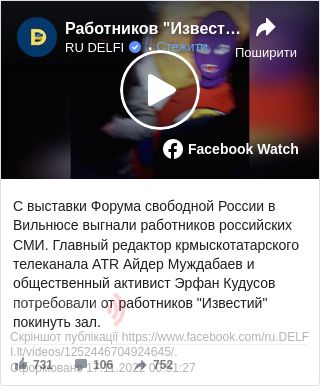 Головний редактор кримськотатарського телеканалу ATR Айдер Муждабаєв і громадський активіст Ерфан Кудусов вимагали від працівників російських «Известий» залишити залу. «Валіть звідси... Геть звідси, ви - окупанти... Ганьба! Ви - в крові!.. Слава Україні!», – кричали на адресу російських журналістів.