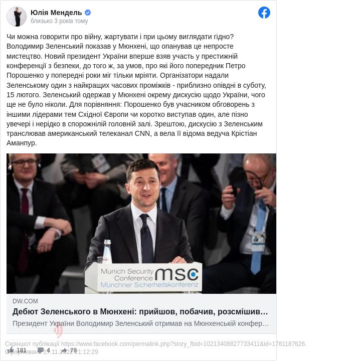 При цьому Мендель додала, що «новий Президент України вперше взяв участь у престижній конференції з безпеки, до того ж, за умов, про які його попередник Петро Порошенко у попередні роки міг тільки мріяти».