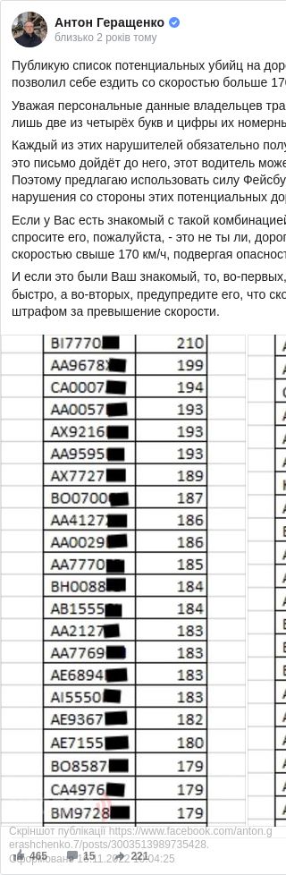 За словами Геращенка, це ті автомобілі, яких система автофіксації помітила у вівторок, 2 червня. Заступник глави МВС назвав водіїв цих авто «потенційними вбивцями на дорозі». Однак, він показав номери машин без останніх двох літер, зіславшись на захист персональних даних.