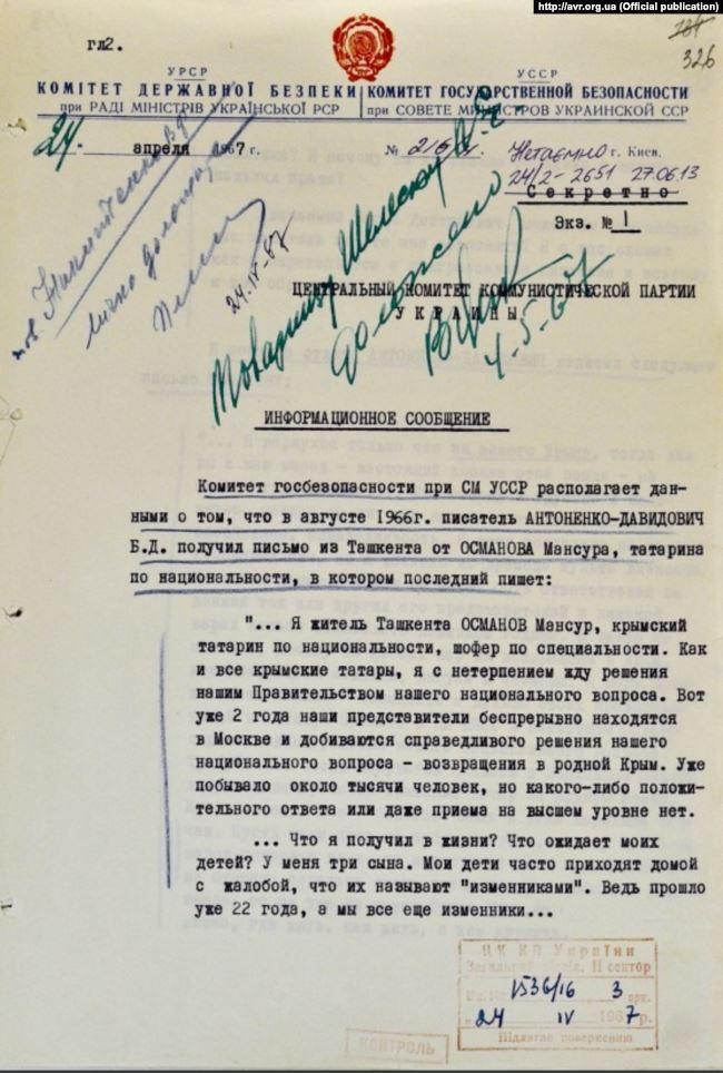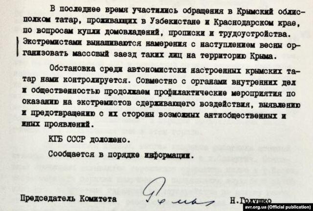 Центр дослідження визвольного руху та архів СБУ оприлюднили документи КДБ про повернення кримських татар з депортації.