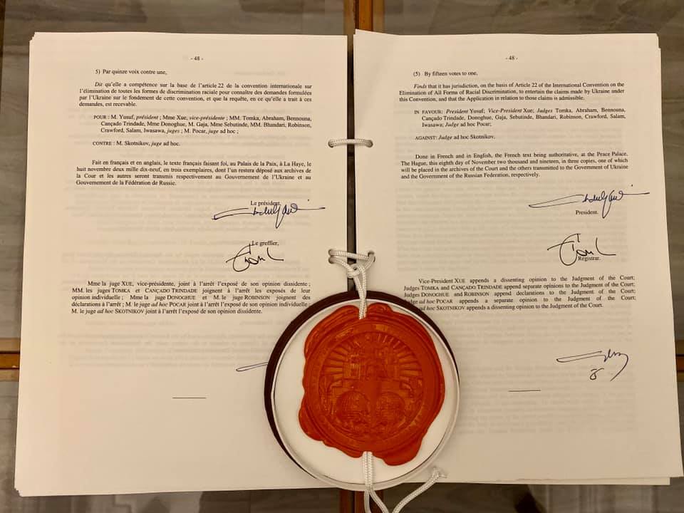 - одноголосно, відхиляє попереднє заперечення Російської Федерації про неприйнятність позову України до Міжнародної конвенції про ліквідацію всіх форм расової дискримінації;