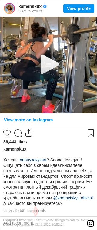 "Хочеш попу, як у Кім? Soooo, lets gym! Відчувати себе у своєму ідеальному тілі дуже важливо. Саме ідеальному для себе, а не для світових стандартів. Спорт приносить колосальну радість та прилив енергії. Не дивлячись на щільний грудневий графік, я намагаюся знайти час на тренування. А як часто ви тренуєтеся", – написала Каменських.