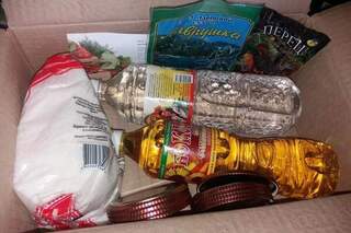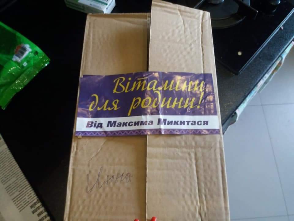 Як видно на фото, продуктовий набір складається з цукру, оцту, рослинної олії, кількох упаковок спецій і декількох штук кришок для консервації. Все запаковано у велику картонну коробку із написом «Від Максима Микитася».