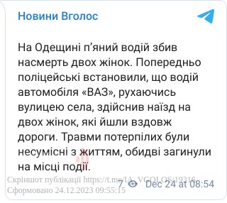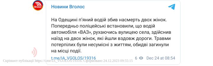 Попередньо поліцейські встановили, що водій автомобіля «ВАЗ», рухаючись вулицею села, здійснив наїзд на двох жінок, які йшли вздовж дороги. Травми потерпілих були несумісні з життям, обидві загинули на місці події.