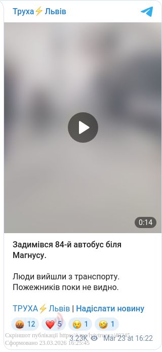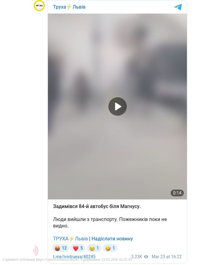 У понеділок, 23 березня, у центрі Львова сталася надзвичайна ситуація з громадським транспортом: біля торгового центру «Магнус» задимівся маршрутний автобус №84.