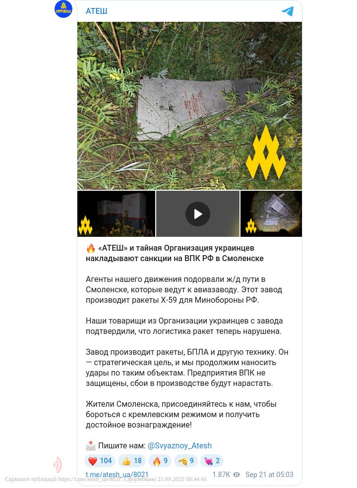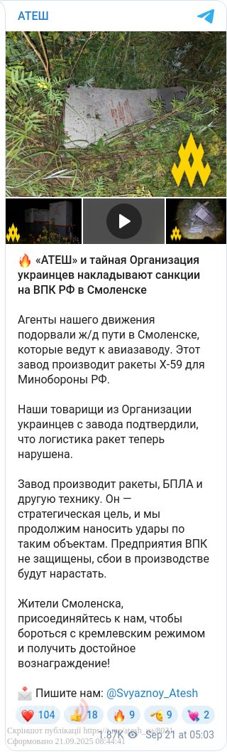 Агенти «Атеш» підірвали залізничні колії в Смоленську, які ведуть до авіазаводу, де виготовляють ракети й безпілотники для Міноборони рф.