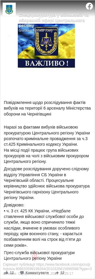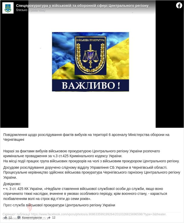 За фактом вибухів на військовому арсеналі військова прокуратура Центрального регіону розпочала карне провадження за ч. 3 ст. 425 Кримінального кодексу України — "Недбале ставлення військової службової особи до служби, якщо воно спричинило тяжкі наслідки, вчинене в умовах особливого періоду, крім воєнного стану". Винним "світить" від п'яти до семи років в'язниці.