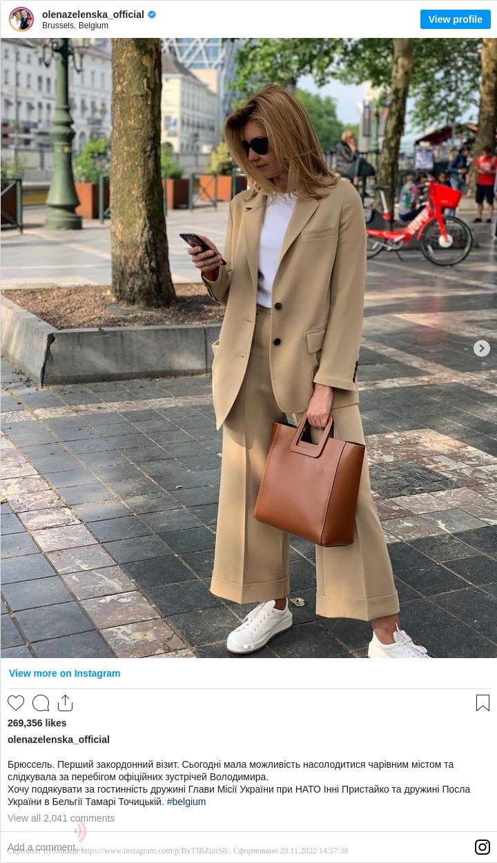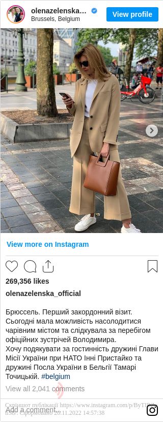 "Перший закордонний візит. Мала можливість насолодитися чарівним містом і стежила за ходом офіційних зустрічей Володимира. Хочу подякувати за гостинність дружині глави Місії України при НАТО Інні Пристайко і дружині посла України в Бельгії Тамарі Точицькій", - написала перша леді.