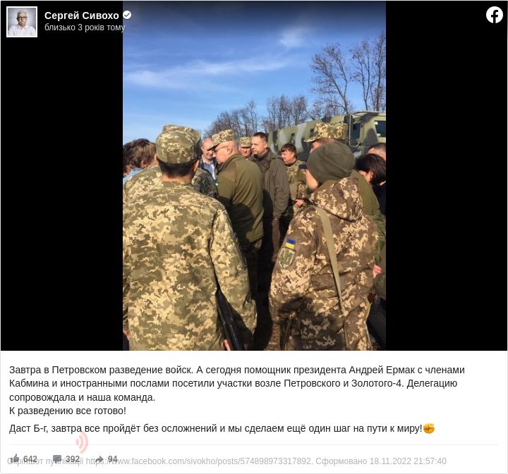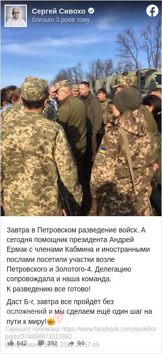 За його словами, завтра, 8 листопада в Петрівському починається розведення військ. А сьогодні помічник президента Андрій Єрмак із членами Кабінету міністрів та іноземними послами відвідали ділянки біля Петрівського і Золотого-4.