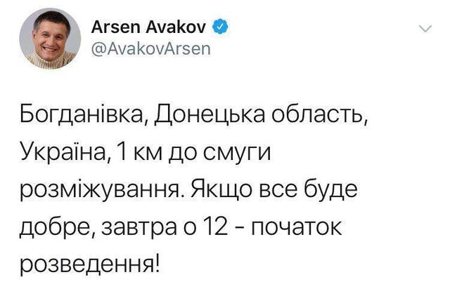 «Богданівка, Донецька область Україна, 1 км до лінії розмежування. Якщо все буде добре, завтра о 12 – початок розведення», – написав він у Twitter.