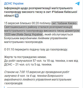 У пресслужбі ДСНС пояснили, що сталася розгерметизація магістрального газопроводу високого тиску діаметром 1020 мм (Київ-Захід України).