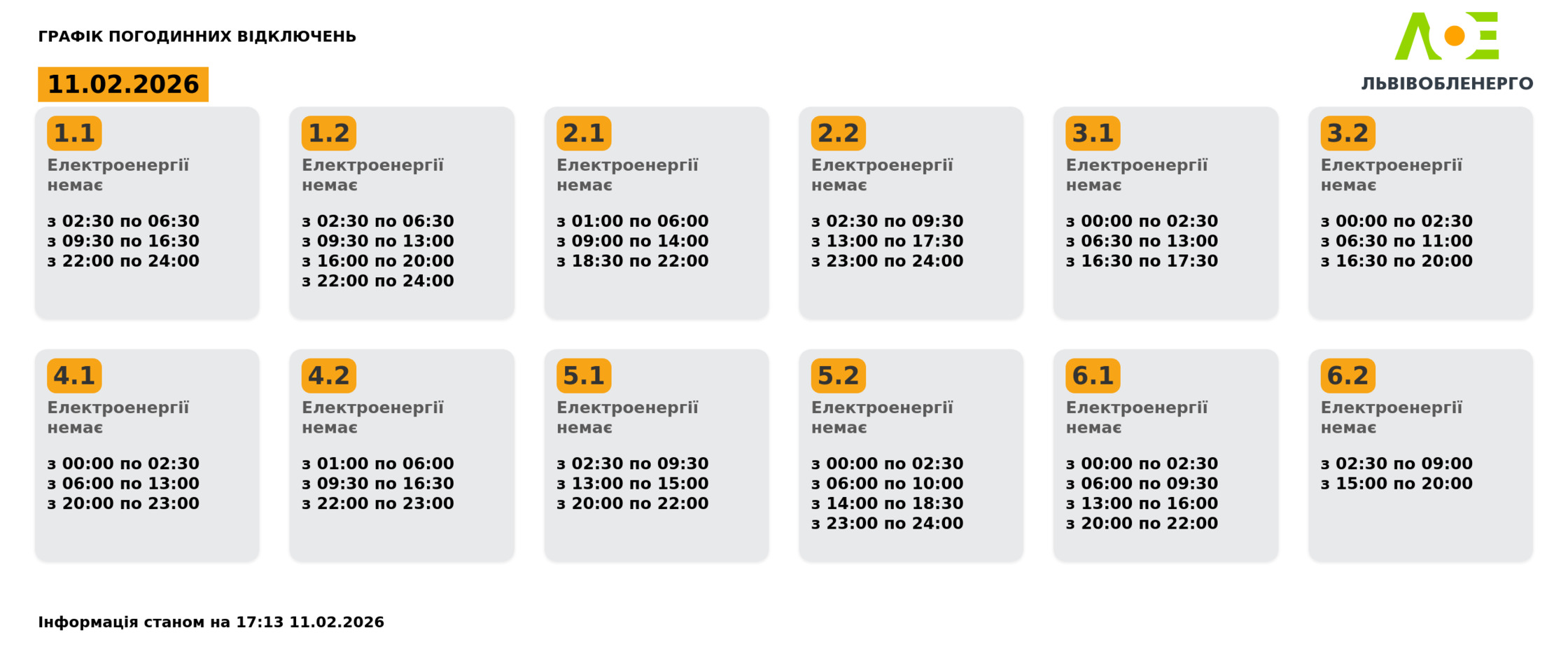 Група 3.2. Електроенергії немає з 00:00 до 02:30, з 06:30 до 11:00, з 16:30 до 20:00.