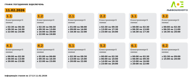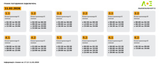 Група 6.1. Електроенергії немає з 00:00 до 02:30, з 06:00 до 09:30, з 13:00 до 16:00, з 20:00 до 22:00.