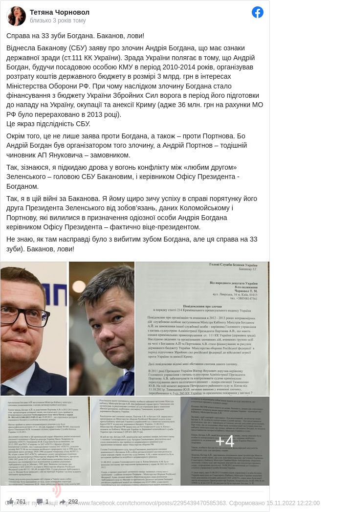 І пояснила: »Віднесла Баканову (СБУ) заяву про злочин Андрія Богдана, що має ознаки державної зради (ст.111 КК України). Зрада України полягає в тому, що Андрій Богдан, будучи посадовою особою КМУ в період 2010-2014 років, організував розтрату коштів державного бюджету в розмірі 3 млрд. грн в інтересах Міністерства Оборони РФ. При чому наслідком злочину Богдана стало фінансування з бюджету України Збройних Сил ворога в період його підготовки до нападу на Україну, окупації та анексії Криму (адже 36 млн. грн на рахунки МО РФ було перераховано в 2013 році). Це якраз підслідність СБУ«.