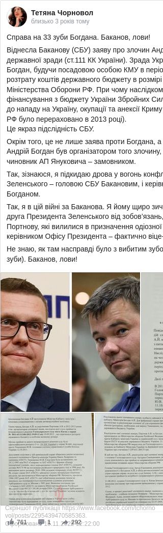 »Так, зізнаюся, я підкидаю дрова у вогонь конфлікту між «любим другом» Зеленського – головою СБУ Бакановим, і керівником Офісу Президента - Богданом. Так, я в цій війні за Баканова. Я йому щиро зичу успіху в справі порятунку його друга Президента Зеленського від зобов’язань, даних Коломойському і Портнову, які вилилися в призначення одіозної особи Андрія Богдана керівником Офісу Президента – фактично віце-президентом. Не знаю, як там насправді було з вибитим зубом Богдана, але ця справа на 33 зуби). Баканов, лови!«, - резюмувала екснардепка.
