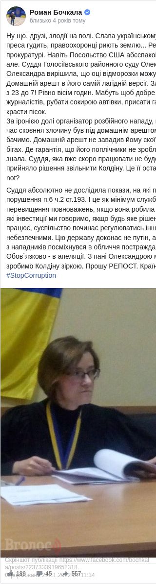 «Реально респект поліції та прокуратурі. Але є одне але. Суддя Голосіївського районного суду вирішила, що підозрювані можуть спокійно гуляти на волі», – оцінив рішення суду Роман Бочкала.