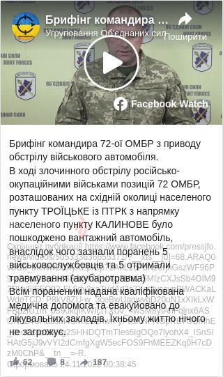 Згідно з його даними, бойовики здійснили обстріл позицій 72 ОМБР, розташованих на східній околиці Троїцького. Стріляли окупанти з напрямку населеного пункту Калинове. Під час обстрілу українських військ бойовики застосували з ПТРК.
