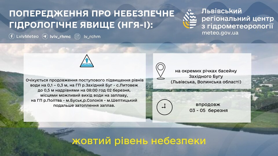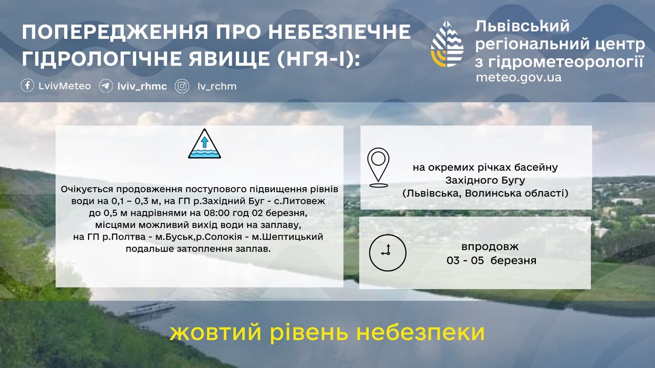 За даними фахівців, небезпечне гідрологічне явище (НГЯ-І) спостерігатиметься протягом 3–5 березня. Підняття рівнів води торкнеться водойм у межах Львівської та Волинської областей.
