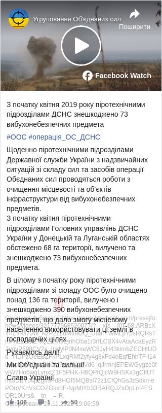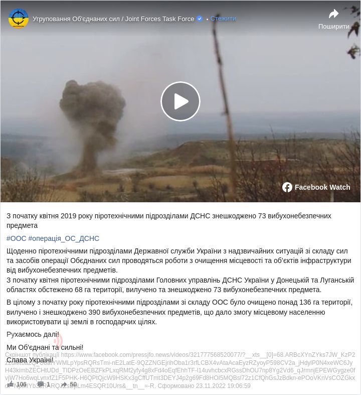 Загалом з початку 2019 року піротехнічні підрозділи зі складу ООС очистили понад 136 гектарів, а також знешкодили 390 вибухонебезпечних предметів. Завдяки цьому місцеве населення може використовувати ці землі у господарчих цілях.