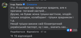 «Мені прикро, що моїй двоюродній сестрі Наташі так зараз погано, і на фоні загострення депресії в неї з’явились емоційні пости в фейсбуці. Я прошу вибачення за її різкі слова в бік України. Це дуже гірко», – зазначив він.