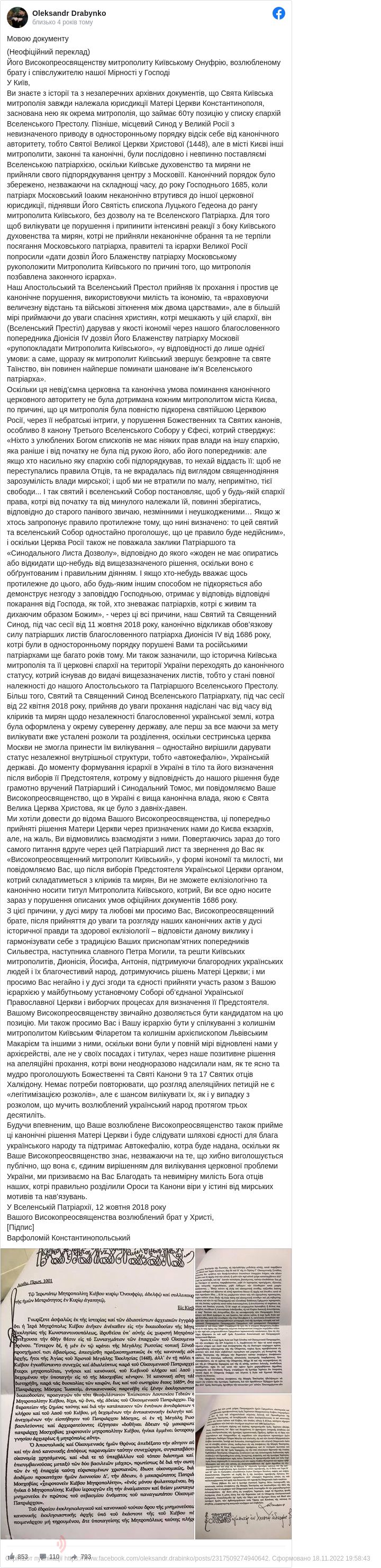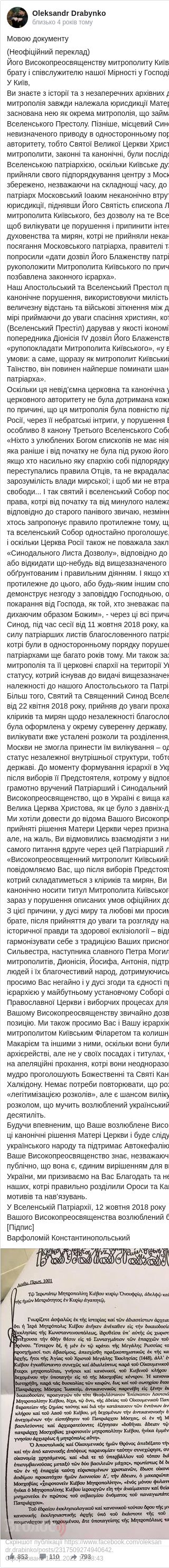 "Святий та Священний Синод Вселенського Патріархату, під час сесії від 22 квітня 2018 року, прийняв до уваги прохання надіслані час від часу від кліриків та мирян щодо незалежності благословенної української землі, котра була оформлена у окрему суверенну державу, але перш за все маючи за мету вилікувати вже усталені розколи та розділення, оскільки сестринська церква Москви не змогла принести їм вилікування – одностайно вирішили дарувати статус незалежної внутрішньої структури, тобто "автокефалію", Українській державі. До моменту формування ієрархії в Україні в тіло та його визначення після виборів її Предстоятеля, котрому у відповідність до нашого рішення буде грамотно вручений Патріарший і Синодальний Томос, ми повідомляємо Ваше Високопреосвященство, що в Україні є вища канонічна влада, якою є Свята Велика Церква Христова, як це було з давніх-давен.