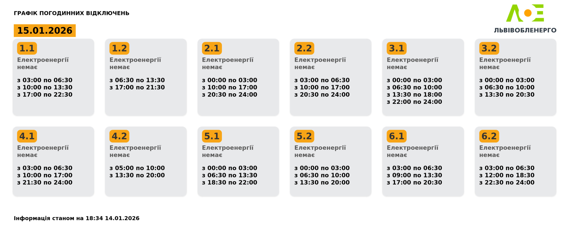 - Група 3.1. Електроенергії немає з 00:00 до 03:00, з 06:30 до 10:00, з 13:30 до 18:00, з 22:00 до 24:00.
