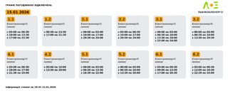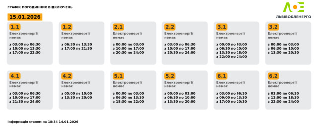 У четвер, 15 січня, на Львівщині діятимуть графіки відключення світла. Електроенергію вимикатимуть усім групам. Світла не буде майже по 14 годин для окремих груп.