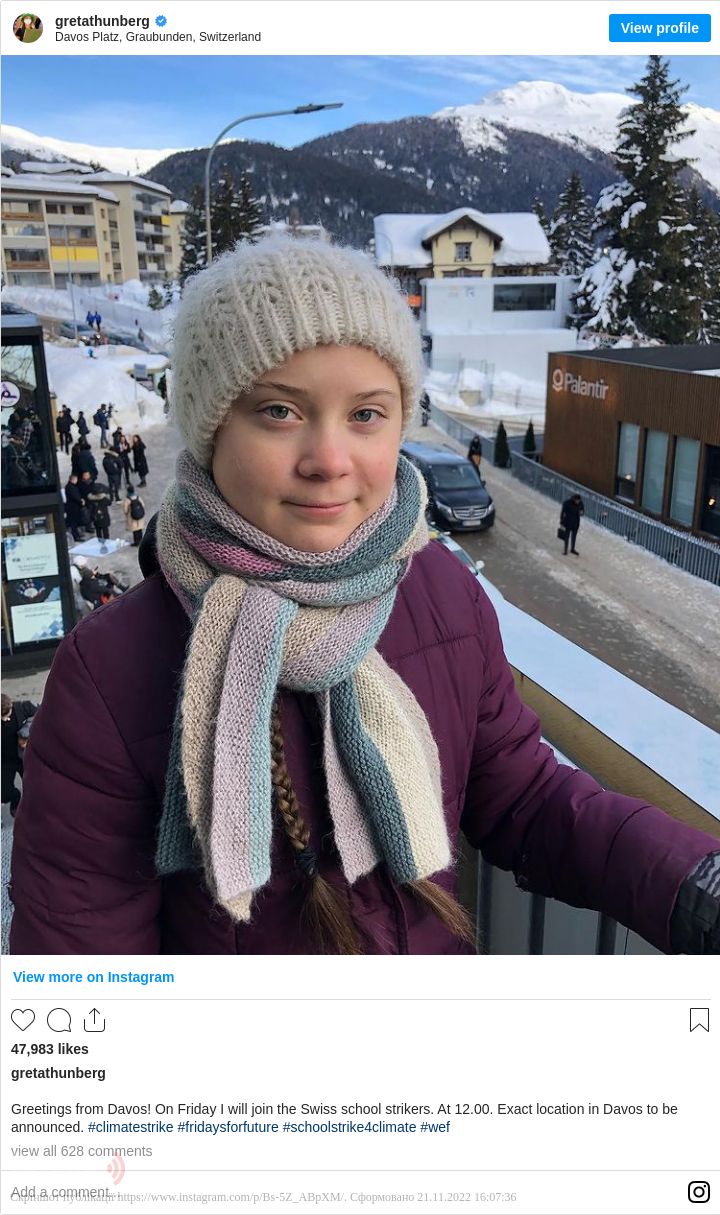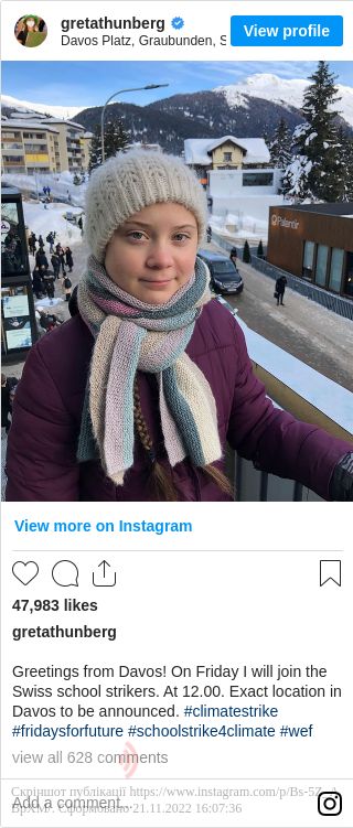 Зазначимо, Грета Тунберг - юна шведська активістка, яка від серпня минулого року кожної п'ятниці сиділа біля шведського парламенту, щоб донести послання про клімат. Дівчина поїхала на поїзді від Швеції до Давоса, щоб підкреслити необхідність використання більш чистих форм транспорту.