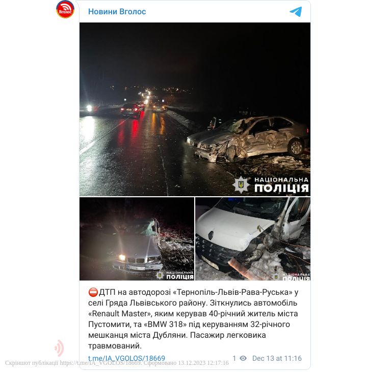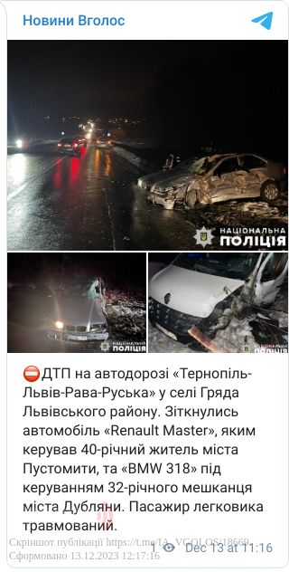 Дорожньо-транспортна пригода сталася 12 грудня, близько 16.20, на автодорозі «Тернопіль-Львів-Рава-Руська» у селі Гряда Львівського району. Зіткнулись автомобіль «Renault Master», яким керував 40-річний житель міста Пустомити, та «BMW 318» під керуванням 32-річного мешканця міста Дубляни. Пасажир легковика травмований.