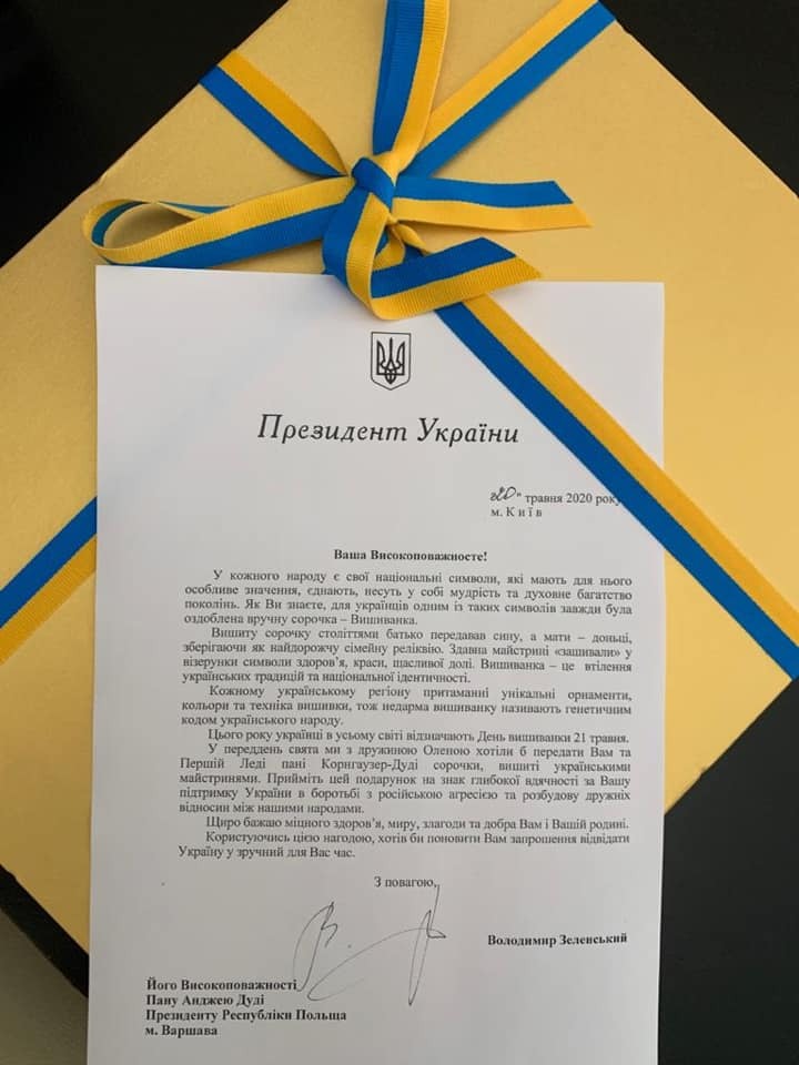 У відповідь Дуда надіслав лист з подякою за гарні українські вишиванки, які славляться далеко за межами України. Президент Польщі додав, що він з дружиною таким чином зможуть долучитися до святкування Міжнародного дня вишиванки.