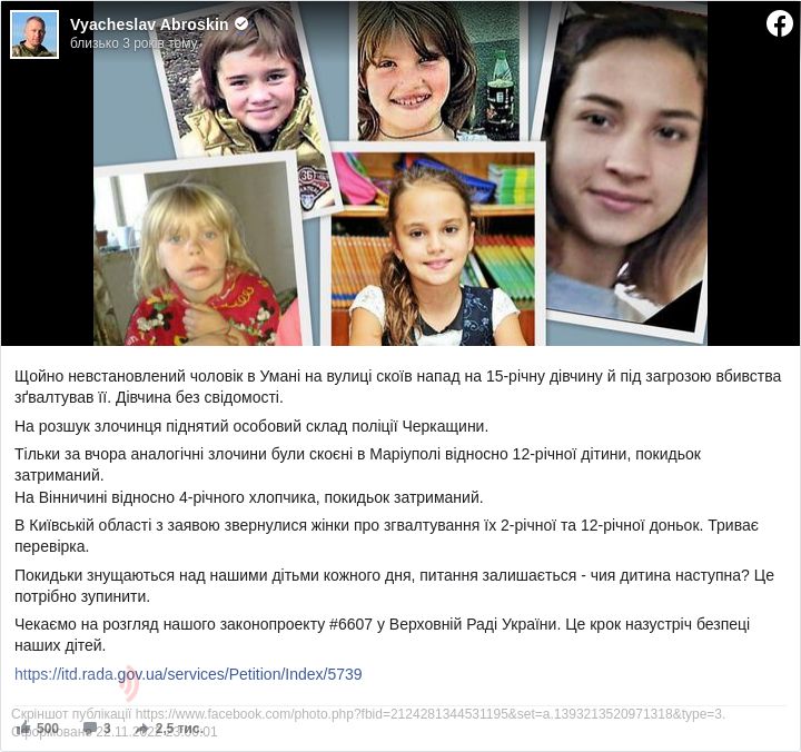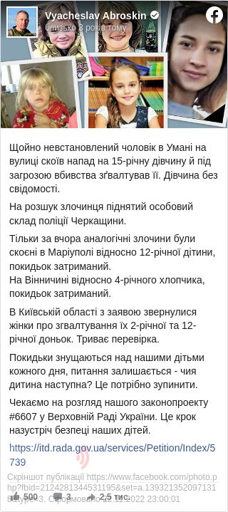 «Покидьки знущаються над нашими дітьми кожного дня, питання залишається - чия дитина наступна? Це потрібно зупинити. Чекаємо на розгляд нашого законопроекту #6607 у Верховній Раді України. Це крок назустріч безпеці наших дітей», - резюмував перший заступник голови Нацполіції.