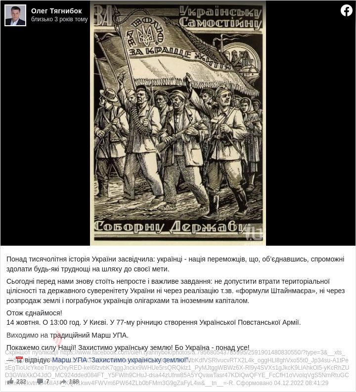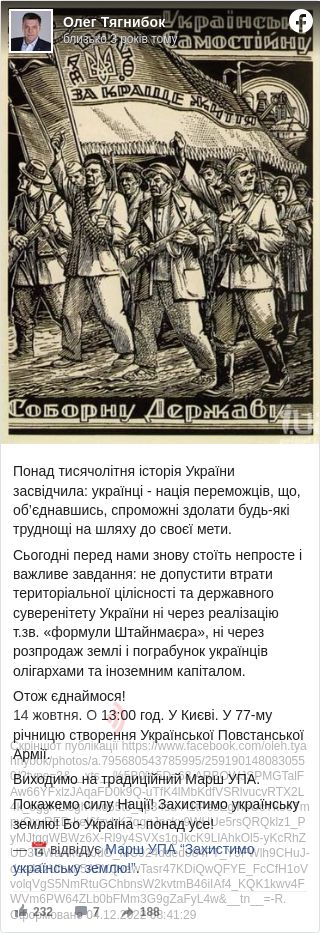 Лідер ВО «Свобода» Олег Тягнибок кличе українців на Марш УПА «Захистимо українську землю!».