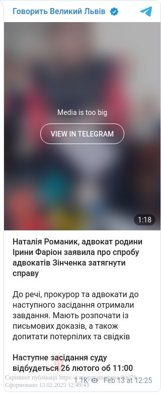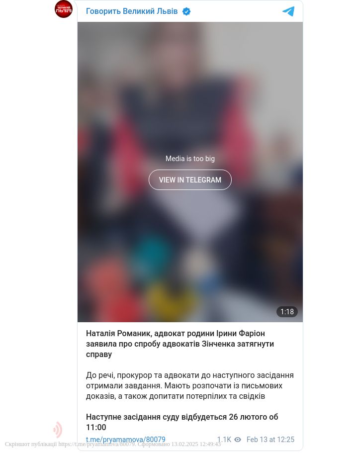 Адвокат родини Ірини Фаріон, Наталія Романик, заявила про намір адвокатів Зінченка затягнути судовий процес.