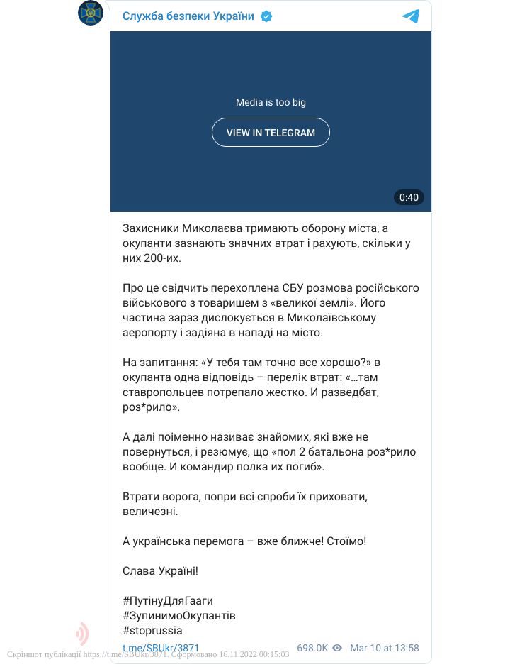 "Захисники Миколаєва тримають оборону міста, а окупанти зазнають значних втрат і рахують, скільки у них 200-их. Про це свідчить перехоплена СБУ розмова російського військового з товаришем з «великої землі». Його частина зараз дислокується в Миколаївському аеропорту і задіяна в нападі на місто", - йдеться у повідомленні.