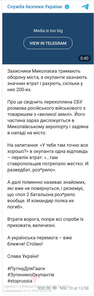 10 березня ЗСУ успішно тримають фронт на всіх напрямках. Ворог продовжує зазнавати безпрецедентних втрат, зокрема і на миколаївському напрямку. Так, українські спецслужби перехопили чергову розмову окупантів, де ті розповідають про колосальну кількість загиблих рашистів та знищення цілих військових підрозділів.