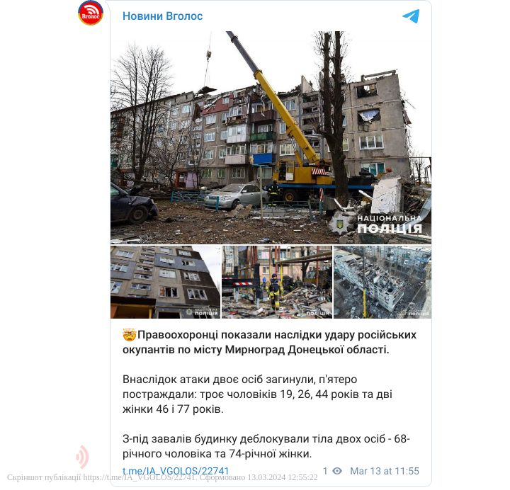 Правоохоронці показали наслідки удару російських окупантів по місту Мирноград Донецької області. Внаслідок атаки двоє осіб загинули.