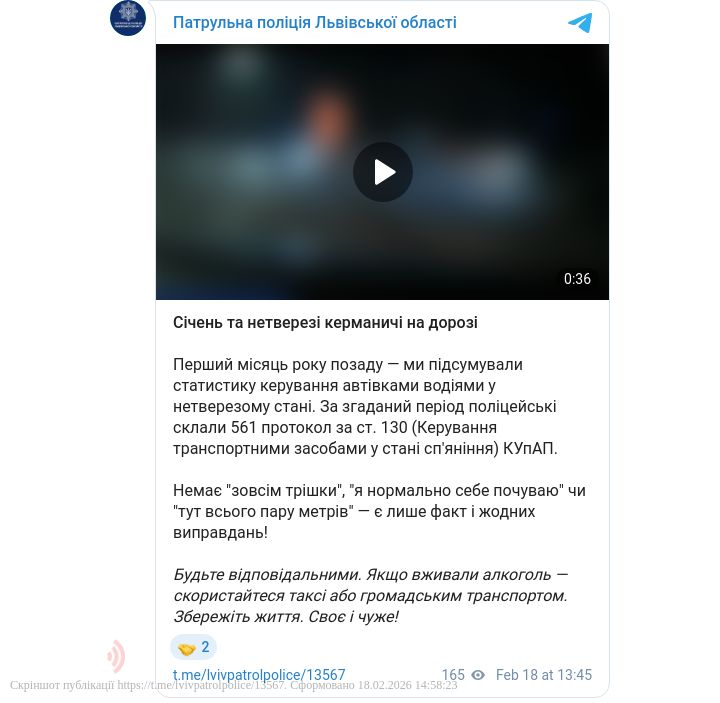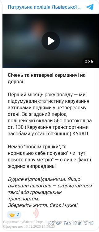 За підсумками січня поліцейські склали 561 протокол за ст. 130 Кодексу України про адміністративні правопорушення (Керування транспортними засобами у стані сп'яніння). Незважаючи на постійні попередження, водії продовжують сідати за кермо після вживання алкоголю, виправдовуючись хорошим самопочуттям або короткими дистанціями поїздки.