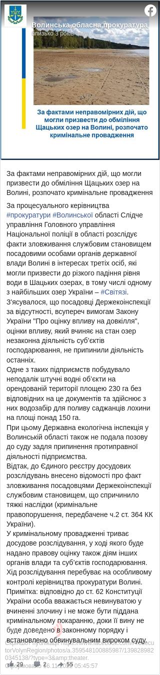 "Слідче управління ГУ Нацполіції області розслідує факти зловживання службовим становищем посадовими особами органів державної влади Волині в інтересах третіх осіб, які могли призвести до різкого падіння рівня води в Шацьких озерах, в тому числі одному з найбільших озер України – Світязь", – йдеться в повідомленні.